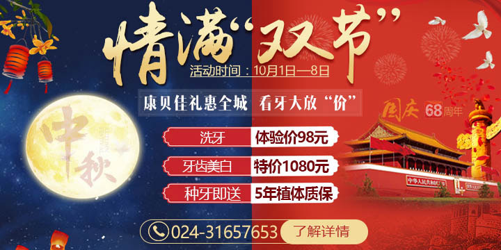 今年国庆节恰逢遇到中秋节,为了迎接中秋国庆双节的来临,沈阳康贝佳口腔特举办了本次活动,送出种牙、美牙、洗牙多重豪礼,意在这个情意浓浓的节日里为各位朋友送上一份祝福、送上一份健康,让更多被牙齿问题困扰的朋友重新拥有一口健康美丽的牙齿。>>拨打024-31657653咨询康贝佳国庆优惠